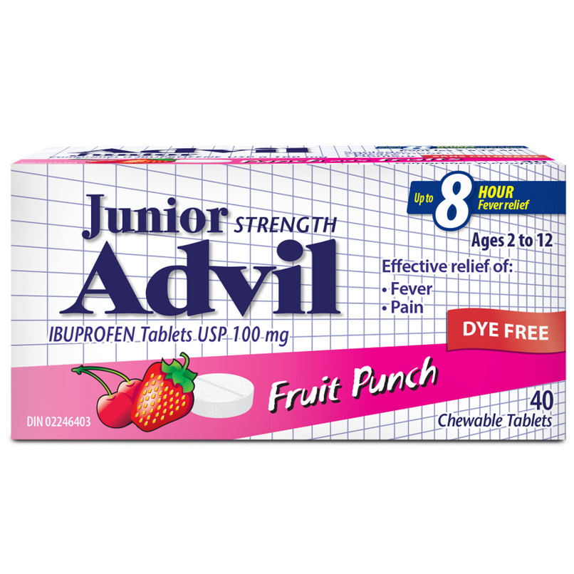 Specially formulated for children 2 to 12 years old, junior strength Advil reduces fever and relieves pain due to immunization, earache, colds or flu, and sore throat. Convenient and portable, these dye-free chewable tablets with a great fruit punch flavour are easy to dose and easy for kids to take—no dosing cup required.