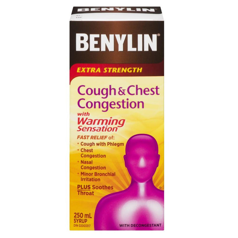 Benylin Extra Strength Cough & Chest Congestion with Warming Sensation Syrup is specially formulated to work in your chest to help clear out heavy congestion while calming your cough and relieving cold symptoms. Its warming properties instantly soothe and coat your throat.