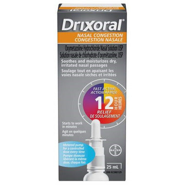 Drixoral Nasal Congestion Spray helps relieve nasal congestion, sinus congestion and pressure due to a cold, hay fever or other types of allergies. It allows you to breathe better when you need it most. It is fast acting, provides sustained 12-hour duration of action, and has a metered pump for a controlled dose every time. Temporarily relieves nasal congestion and sinus pressure due to a cold, hay fever or other upper respiratory allergies.