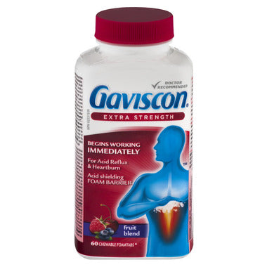Gaviscon Extra Strength Chewable Foamtabs begin working immediately. Provides day & night-time relief of heartburn, acid reflux and GERD (Gastro-Esophageal Reflux Disease) symptoms. Doctor recommended Gaviscon (R) forms a protective foam barrier that blocks acid reflux for hours. Free from aluminium, lactose & gluten.