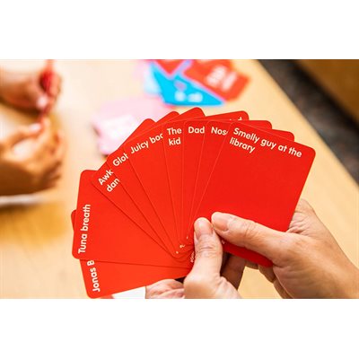 The rotating judge picks a Blue Card from the deck, then they read the Blue Card out loud to all the players and then place it on the table so everyone can see it. Each player (except the judge) decides which of their 10 Red Cards makes the funniest pair with the Blue Card in play. Once the judge has a Red Card from each player, the judge then selects the funniest Red Card to go with the Blue Card.