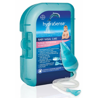 Developed with pediatricians, hydraSense Nasal Aspirator Starter Kit is an effective and gentle way to clear tiny congested noses. Use when your child is having trouble breathing because of dry or obstructed nasal passages due to colds or nasal congestion. The Nasal Aspirator Starter Kit liquefies mucus and snot and removes the mucus effectively relieving baby nasal congestion and nasal cold symptoms - helping your baby breathe better. Because infants cannot blow their own nose, substances such as dust, pollen, bacteria, and smoke build up in nasal secretions, and nasal congestion may increase the risk of upper respiratory tract, ear, and sinus infections. This excess mucus/snot can be eliminated by cleaning the baby's nose daily, which also helps the baby breathe more easily. hydraSense Baby Nasal Care products are an effective, easy-to-use method of comfortably cleansing nasal cavities and facilitating nose blowing. Products containing liquid are made of 100% natural-source, sterile, undiluted seawater solution that is exclusively sourced from the Bay of Saint-Malo in France - renowned for its strong currents, providing oxygenation and a wealth of naturally occurring mineral salts and trace elements. The manufacturing process desalinates seawater to an optimum level to preserve the cleansing effects of seawater. hydraSense Baby Nasal Care products are non-medicated, contain no preservatives and can be used several times daily to cleanse nasal cavities. To be sure this product is right for you, always read and follow the label