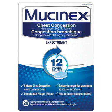 When you’re sick, mucus can be a master of mayhem. But chest congestion† relief is just a dose away — with Mucinex® immediate and extended-release bi-layer tablets that start to release fast and last for up to 12 hours*. A cough medicine that makes coughs more productive by loosening phlegm in the chest, providing fast-acting relief for chest congestion and excess mucus due to the common cold.""