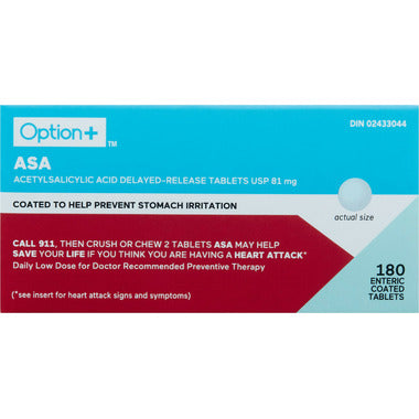 Option+ Acetylsalicylic Acid (ASA) Delayed Release USP 81 MG Enteric Coated tablets provide a daily low dose for doctor recommended preventative therapy of potential heart attacks. Each tablet is coated to help prevent stomach irritation.