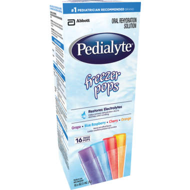 Pedialyte Freezer Pops are a cool way to provide your child the fluid and electrolytes needed to help prevent dehydration. Restores fluids and minerals lost in children with mild to medium diarrhea. Just pop them in the freezer, freeze and eat! Each box contains four great-tasting flavors - Grape, Cherry, Orange and Blue Raspberry.