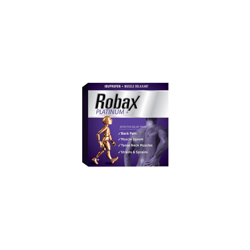For effective relief of back pain associated with muscle spasm, tense neck muscles, strains and sprains. Robax Platinum contains an analgesic (ibuprofen) to relieve pain and a muscle relaxant (methocarbamol) to relax tense muscles.