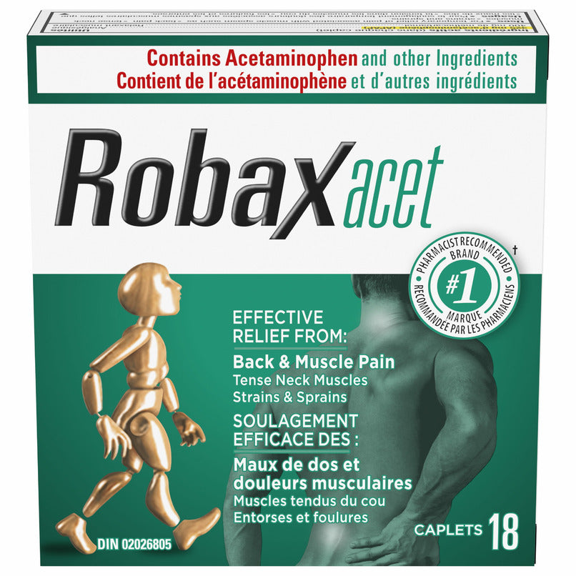 Robaxacet caplets contain an analgesic (325 mg Acetaminophen) to relieve pain and a muscle relaxant (400mg Methocarbamol) to relax tense muscles.