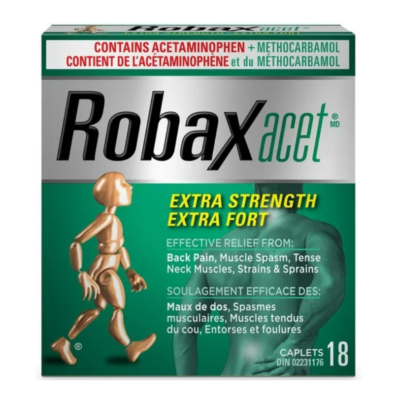 For effective relief of back pain associated with muscle spasm, tense neck muscles, strains and sprains. Robaxacet Extra Strength contains an analgesic (acetaminophen) to relieve pain and a muscle relaxant (methocarbamol) to relax tense muscles.