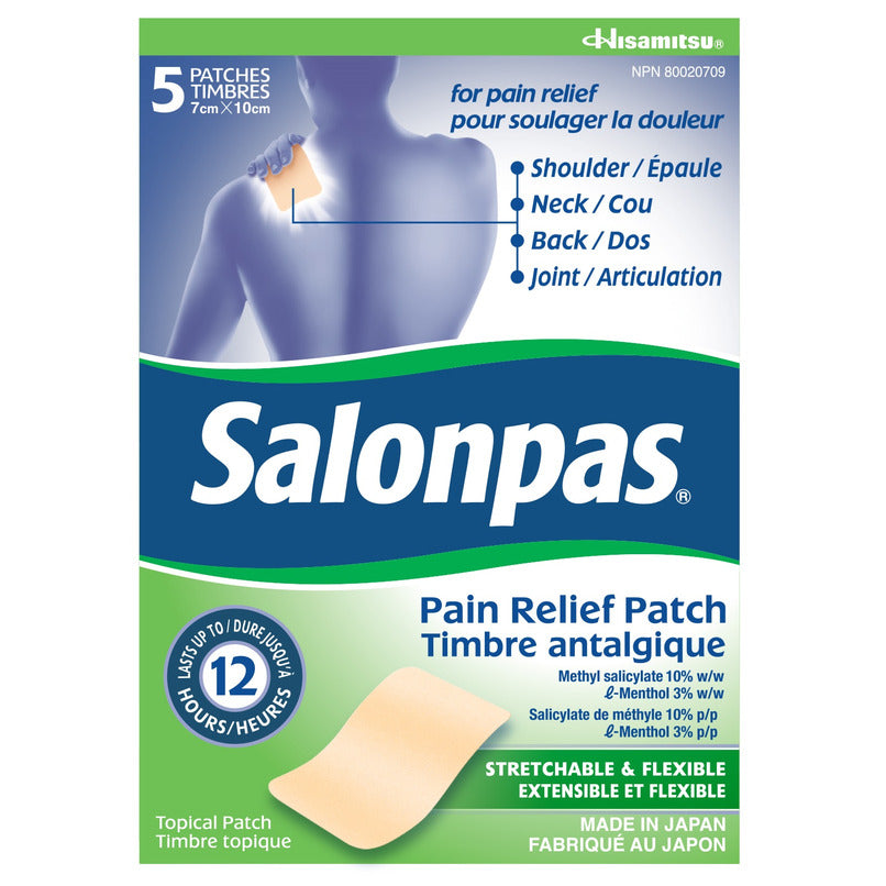 Salonpas 12 Hour is labeled for the temporary relief of mild to moderate pain associated with arthritis, sprains, bruises and simple backache. Provides effective relief for up to 12 hours and contains two powerful pain fighting ingredients, menthol and methyl salicylate.