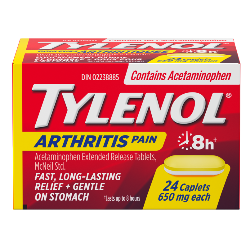 Tylenol Arthritis Pain products use a patented bi-layer caplet for fast plus long lasting relief of arthritis pain for up to 8 hours. The first layer dissolves quickly to relieve pain fast. The second layer is time-released to provide extended relief that lasts all work day (up to 8 hours of relief).