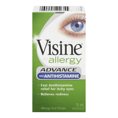 Visine for Allergy Advance with Antihistamine combines an antihistamine and a decongestant to effectively relieve itching, excessive tearing and redness of the eye caused by allergies (pollen, trees, grass, ragweed, dust, pets and mold).